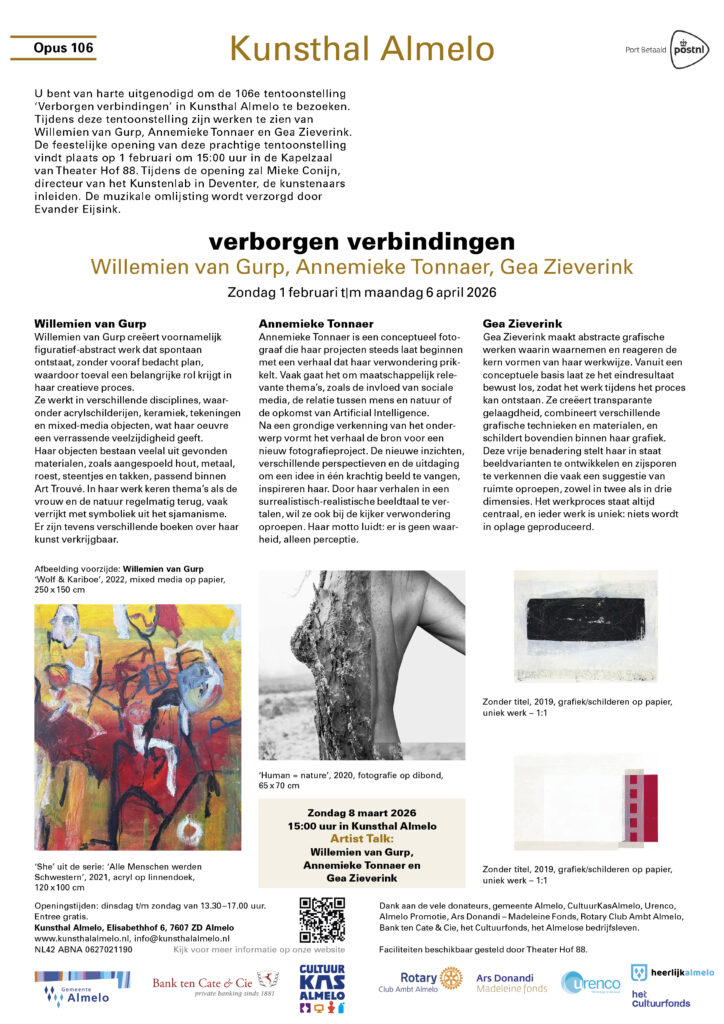1 februari – 6 april expo Verborgen Verbindingen samen met Gea Zieverink en Annemieke Tonnaer in Kunsthal Almelo